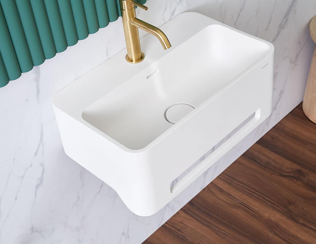 Vasque sanydur gel coat suspendu rectangulaire avec bonde click-clack avec débordement intégré blanc mat.