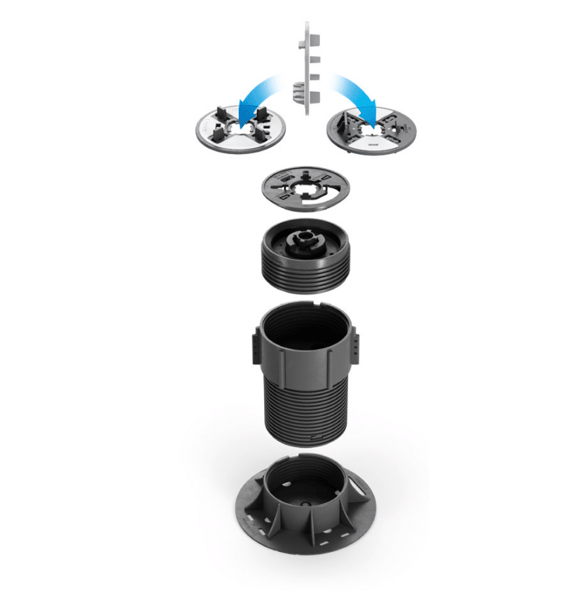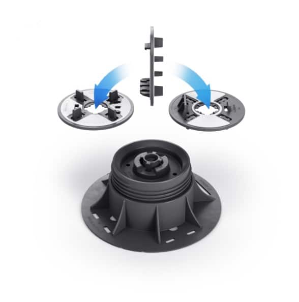 Ce plot présente une grande nouveauté: le tête réversible du plot SR et SRT head of the SRT en bi matière (PP + caoutchouc), d'un côté elle est préparée pour la pose des dalles avec le dessin des ailettes et de l'autre côté elle est préparée pour la pose des lambourdes en aluminium et bois.